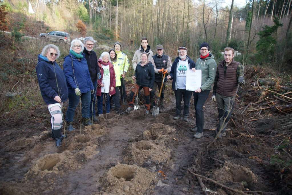 Gemeinsame Pflanzaktion im Hörster Kurpark (v.l.n.r.) Petra Thees (Fairtrade-Gruppe Lage), Ute Habigsberg-Bicker und Gerhard Bicker (Bündnis 90/Die Grünen-Fraktion im Rat), Margret Behnisch (Fairtrade-Gruppe Lage), Anja Wiesner, Anja Neuwöhner und Ilka Beermann (alle Fachteam Umweltplanung), Leon Steinhage, Dirk Steinhage (CDU-Fraktion im Rat), Helmut Behnisch (Fairtrade Gruppe Lage), Bürgermeister Matthias Kalkreuter und Jan Altemöller (Förster, Forstverwaltung Spiegelsberge)