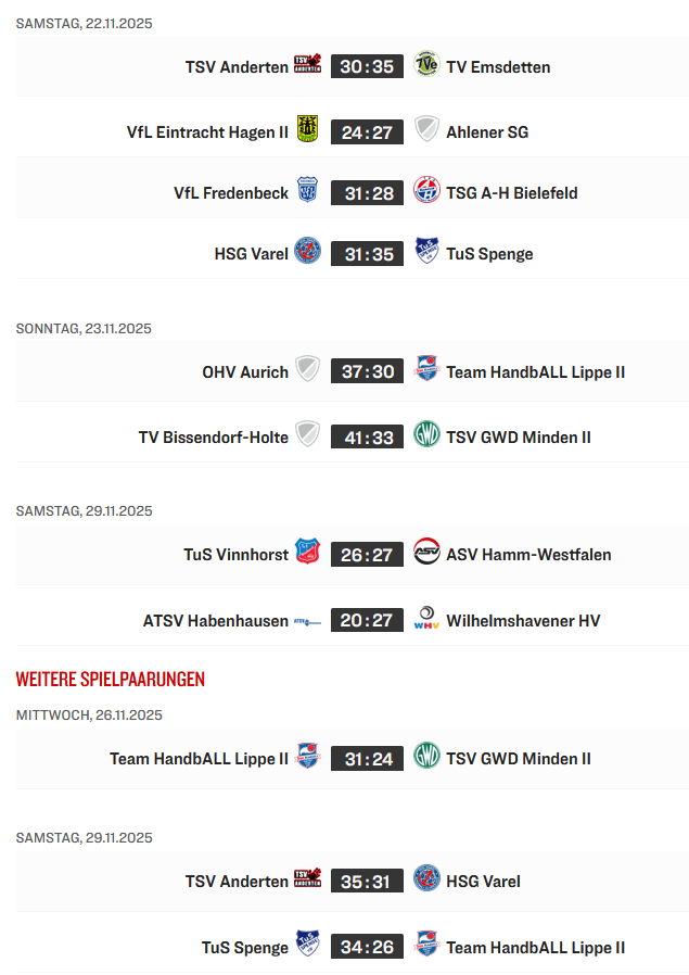 ![]() | VfL Eintracht Hagen II VfL Eintracht Hagen II | 12 | 5 | 0 | 7 | 355:380 | -25 | 10:14 | |