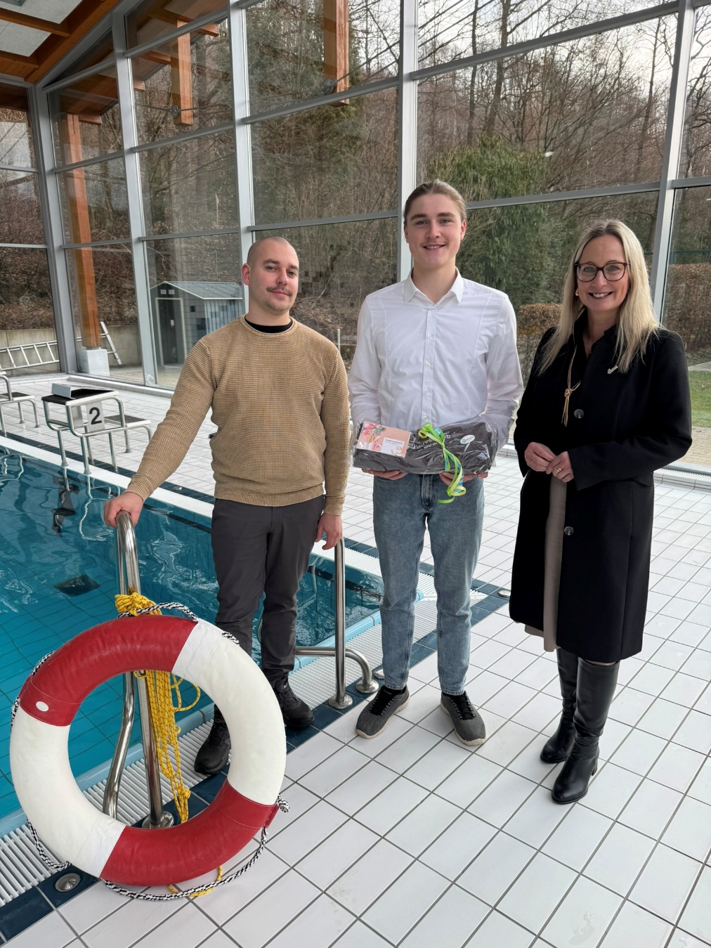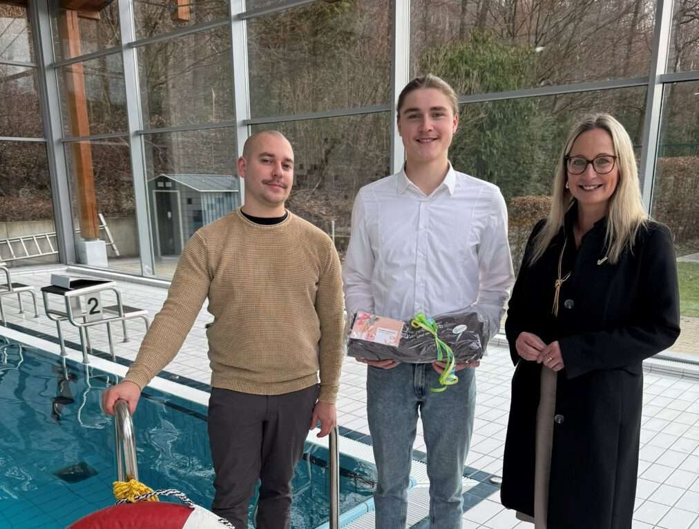 Bürgermeisterin Ulla Berhorst-Schäfers (re.) und Steffen Willeke (Waldschwimmbad) gratulieren Bastian Lues zum erfolgreichen Abschluss seiner Ausbildung.
