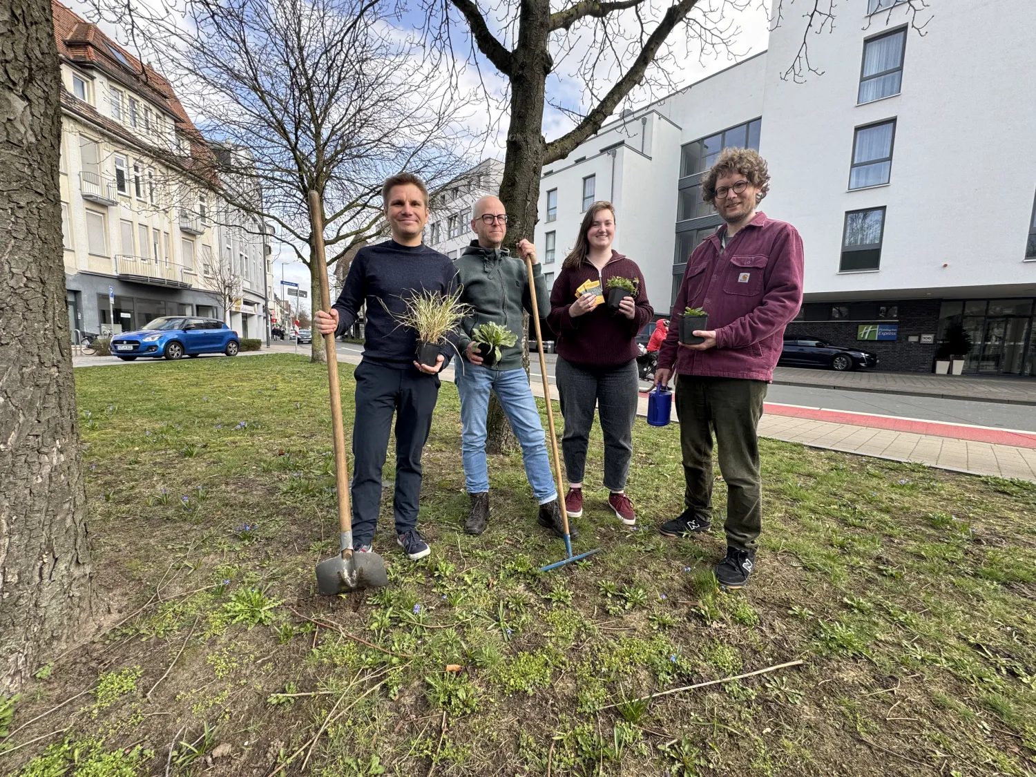 BU: Rufen gemeinsam zum Wettbewerb „abpflastern“ auf: (v.l.) Leif Pollex (Klimabeauftragter), Hans-Bernd Hensen (stellv. Leitung Fachbereich Umweltschutz), Wiebke Dreessen (Beauftragte für Umwelt und biologische Vielfalt) und Dr. Ulrich Zumkier (Leitung Fachbereich Umweltschutz). Foto: Stadt Gütersloh