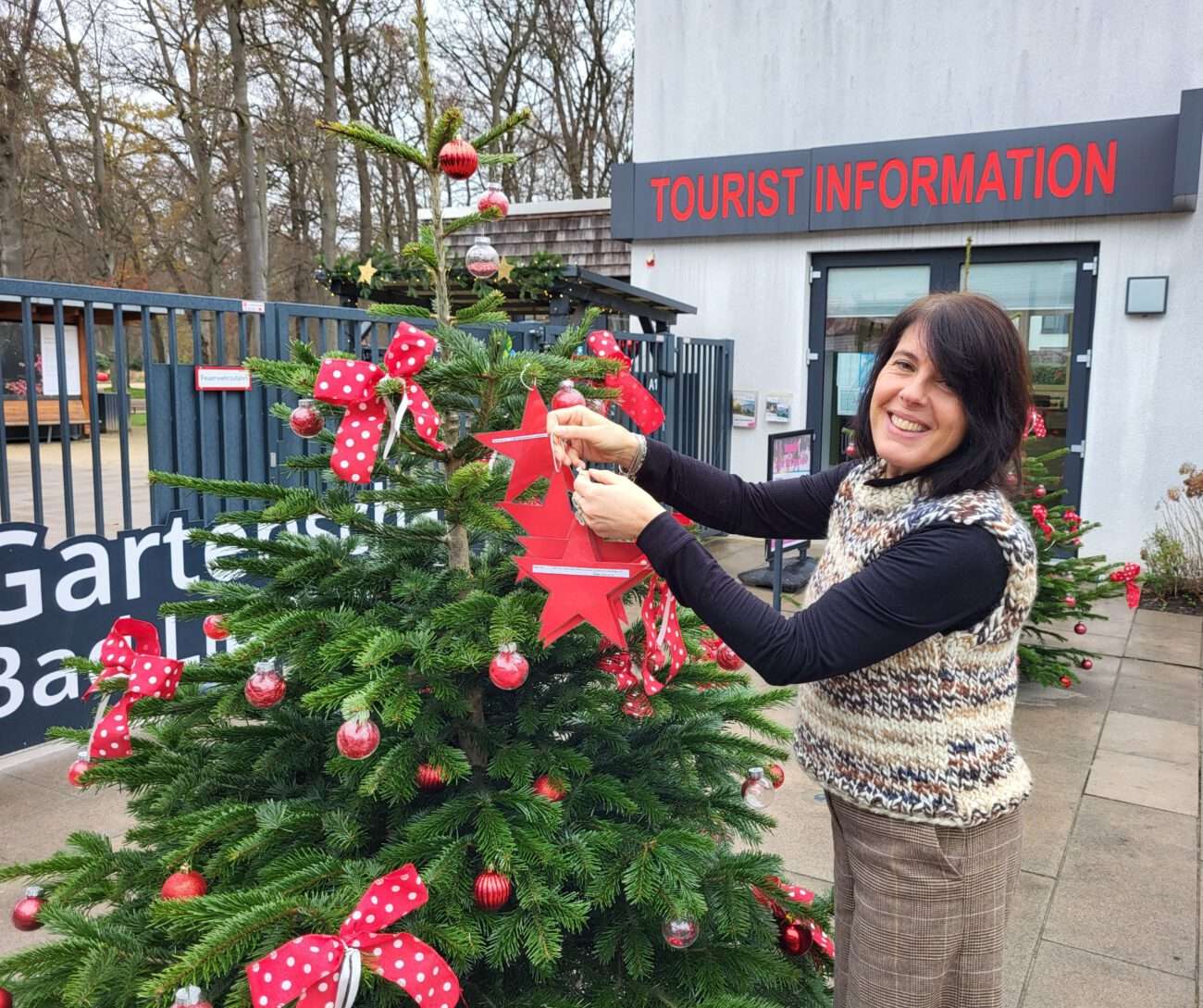 Stadtmarketing-Chefin Asli Noyan wird den „Baum der Wünsche“ vor der Tourist Information mit ihrem Team schmücken. Jeder der roten Sterne wird mit dem Wunsch eines Kindes aus Bad Lippspringe versehen und kann ab Samstag, 6. Dezember, um 10.00 Uhr abgenommen und erfüllt werden +++ Foto: Sabrina Düsenberg
