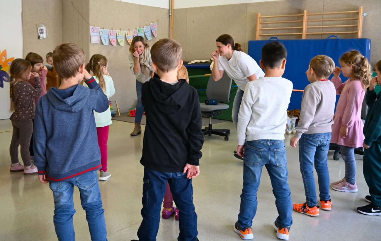 Verena Blume und Julia Hoppe besuchen nach und nach die städtischen Kitas und bringen ihnen das Thema Resilienz näher. Hier zu sehen sind die Kinder der Kita Steinhausen bei einer der Bewegungseinheiten im Rahmen der Schulung.