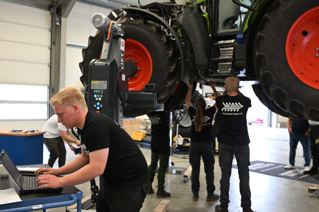 Dieses Jahr gehören zum Team Werkstatt Live 17 Teammitglieder, die ein breites Spektrum abdecken, vom Auszubildenden bis hin zur Meisterin. „Es sind einige im Team, die auch schon letztes Mal dabei waren, aber auch viele neue, frische Gesichter“, sagt Lena Heckmann vom Bundesverband LandBauTechnik e.V. „Wir freuen uns sehr, dass sich viele junge Leute bereit erklärt haben dabei zu sein und ihre Arbeitgeber sie dafür freigestellt haben.“ In der CLAAS Academy in Steinhagen wurden zur Vorbereitung spezielle Trainingstage für das Werkstatt Live-Team veranstaltet, dessen Mitglieder dafür aus ganz Deutschland anreisten. Dabei lag der Schwerpunkt nicht nur auf den vielfältigen Tätigkeiten rund um Maschinen, sondern auch auf modernen digitalen Analyse- und Diagnose-Tools, die heute aus dem Berufsfeld nicht mehr wegzudenken sind. Auch an Hochvolt-Technik wird gearbeitet.