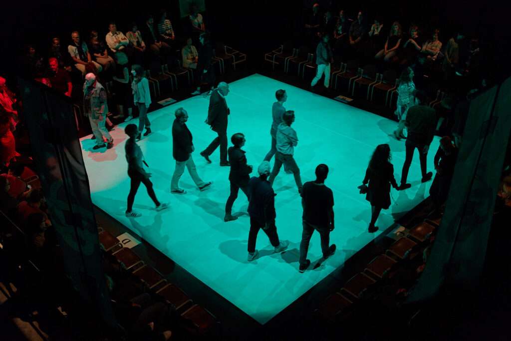 Das Publikum sitzt in einem Quadrat, beobachtet sich gegenseitig und hört über Kopfhörer