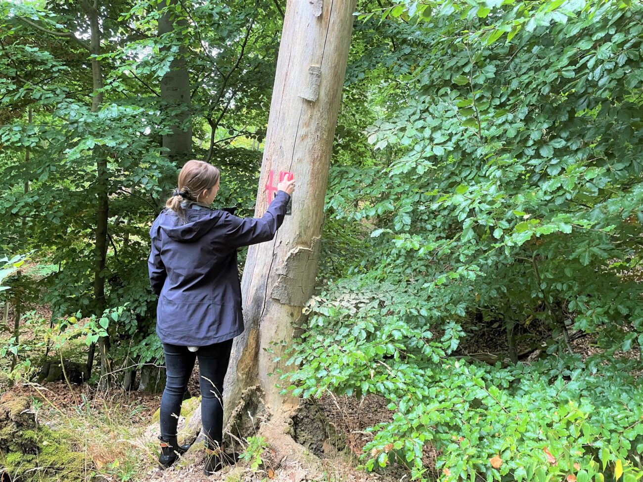 In der vergangenen Woche wurden durch Förster Blum und Svenja Blome (Städtische Mitarbeiterin im Bereich Forst) die vorerst letzten Habitatbäume ausgewiesen. Dabei erhielten die Bäume eine entsprechende Farbmarkierung und die Koordinaten der Bäume wurden digital erfasst. Die beiden Bäume wurden auf dem Schildberg im Bereich der historischen Schildburganlage markiert – ein Ort, an dem sich Naturschutz und Geschichte auf besondere Weise miteinander verbinden.