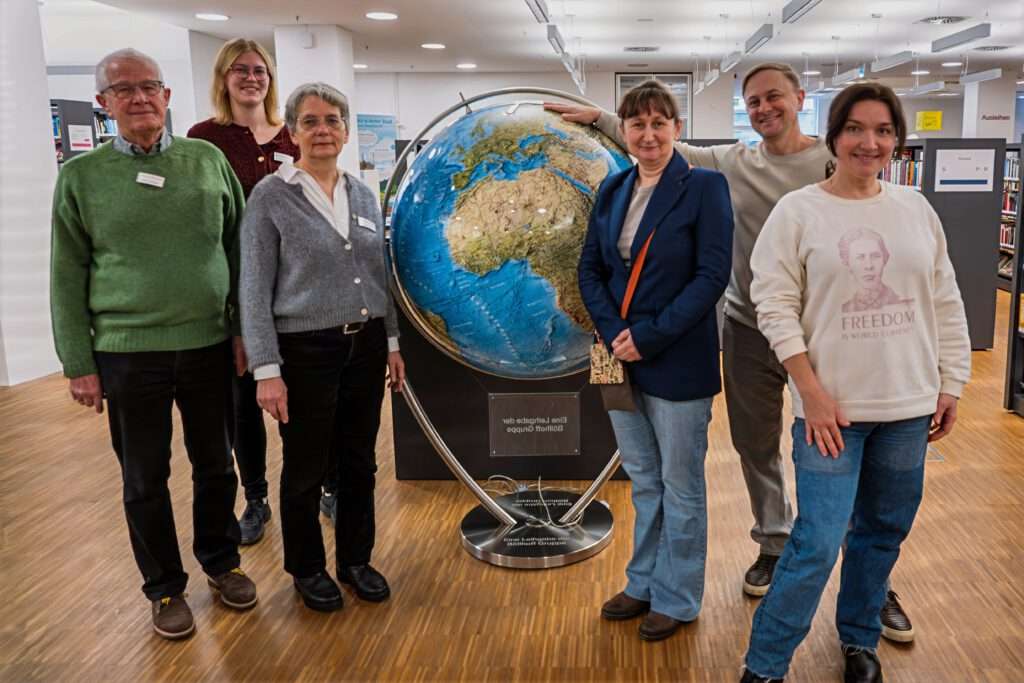 Freuen sich über 10 erfolgreiche Jahre „Dialog in Deutsch“ (v. l.): Hans Kroeger, Koordinator Team „Dialog in Deutsch“, Lena Große-Aschoff, Verantwortliche für die Interkulturelle Arbeit der Stadtbibliothek Bielefeld, Christa Krebs, Ehrenamtliche im Team „Dialog in Deutsch“, Iulia Capros, Direktorin der Stadtbibliothek, Volodymyr und Svitlana Hurenko, Teilnehmende aus der Ukraine. Foto: Julia Rathert.