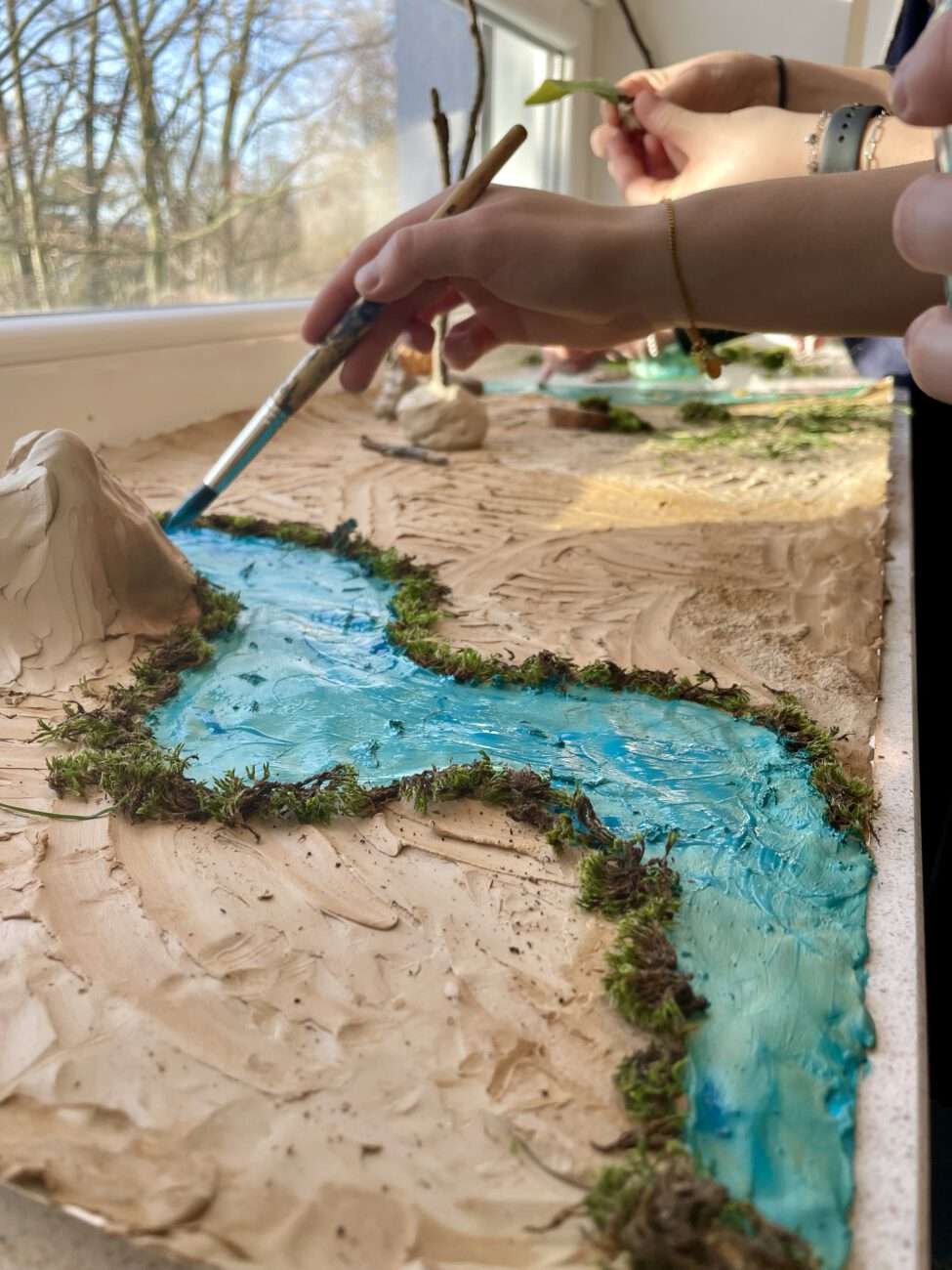 Künstlerin Anna Degenkolb lud die Studierenden zu einer künstlerisch experimentellen Arbeitsweise ein, bei der Materialien wie Ton und Farben sowie freie Zeichen- und Drucktechniken spielerisch erkundet wurden.