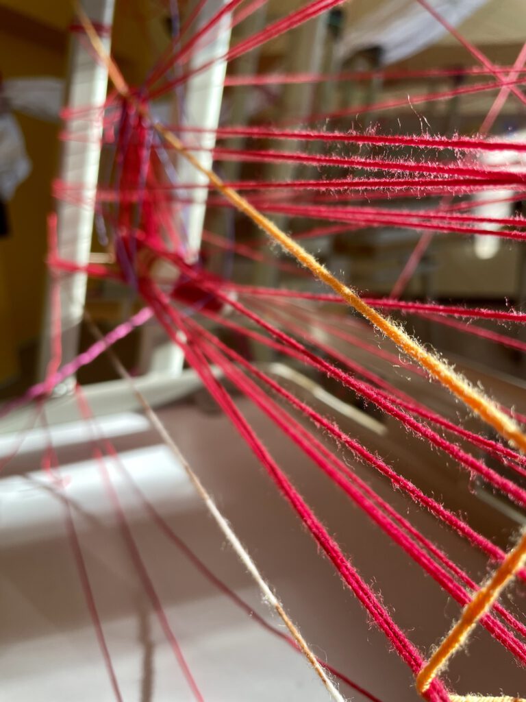 Die Künstlerin Katharina Hagemann bot im Workshop „Total versponnen“ an, dem Eigensinn des Fadens in ästhetischen Erkundungen auf der Spur zu sein. Neben Frottagen, Stickereien und Drucken wurde ein ganzes Klassenzimmer nebst angrenzendem Außenbereich eingespannt, vernetzt, geknotet und verwickelt.