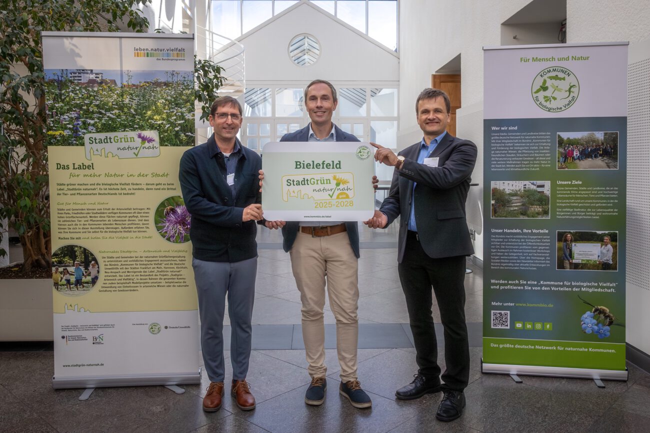 Sebastian Richter (Mitte), Leiter der Grünflächenunterhaltung im Umweltbetrieb, hat die Auszeichnung von Dr. Uwe Messer (links, Projektleiter Label Stadtgrün naturnah) und Robert Spreter (rechts, Geschäftsführer Kommbio) entgegengenommen. Foto: Stadt Bielefeld/UWB