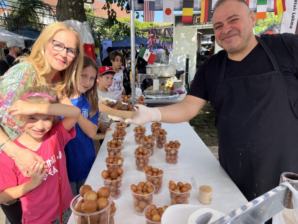 Der Austausch zwischen den Kulturen stand auch an den Ständen im Mittelpunkt. So etwa bei Evi Gega, die 2011 aus Griechenland nach Gütersloh kam. Gemeinsam mit ihren Töchtern Maria und Ekaterini probierte sie türkische Quarkbällchen am Stand von Halil Oskay. Erstmals dabei war auch der Verein „Brücke der Vielfalt“ der iranischen Community. Am liebevoll gestalteten Stand wurden persische Spezialitäten wie Grünkohleintopf mit Reis serviert. „Ich lebe seit 50 Jahren in Gütersloh und liebe die Stadt mehr als meine Geburtsstadt im Iran“, sagte Farzaneh Sattar, die gemeinsam mit Rosa Siri kochte. Der Austausch mit anderen Kulturen liege ihr besonders am Herzen. Auch portugiesisches Lebensgefühl war vertreten: Miguel Gomez, gebürtiger Gütersloher mit portugiesischen Wurzeln, schenkte traditionelles Sagres-Bier aus – mit einem Augenzwinkern erklärte er: „Bier verbindet.“ Besonders begehrt war bei den Besuchern der Thailand-Stand. „Hähnchen-Spieße mit Erdnuss-Sauce sind bei den Leuten der Renner“, sagt Bonruan Perkmann strahlend. Seit 1994 lebt sie in Gütersloh. Ihr persönliches Highlight bei Gütersloh international: das Bühnenprogramm.
