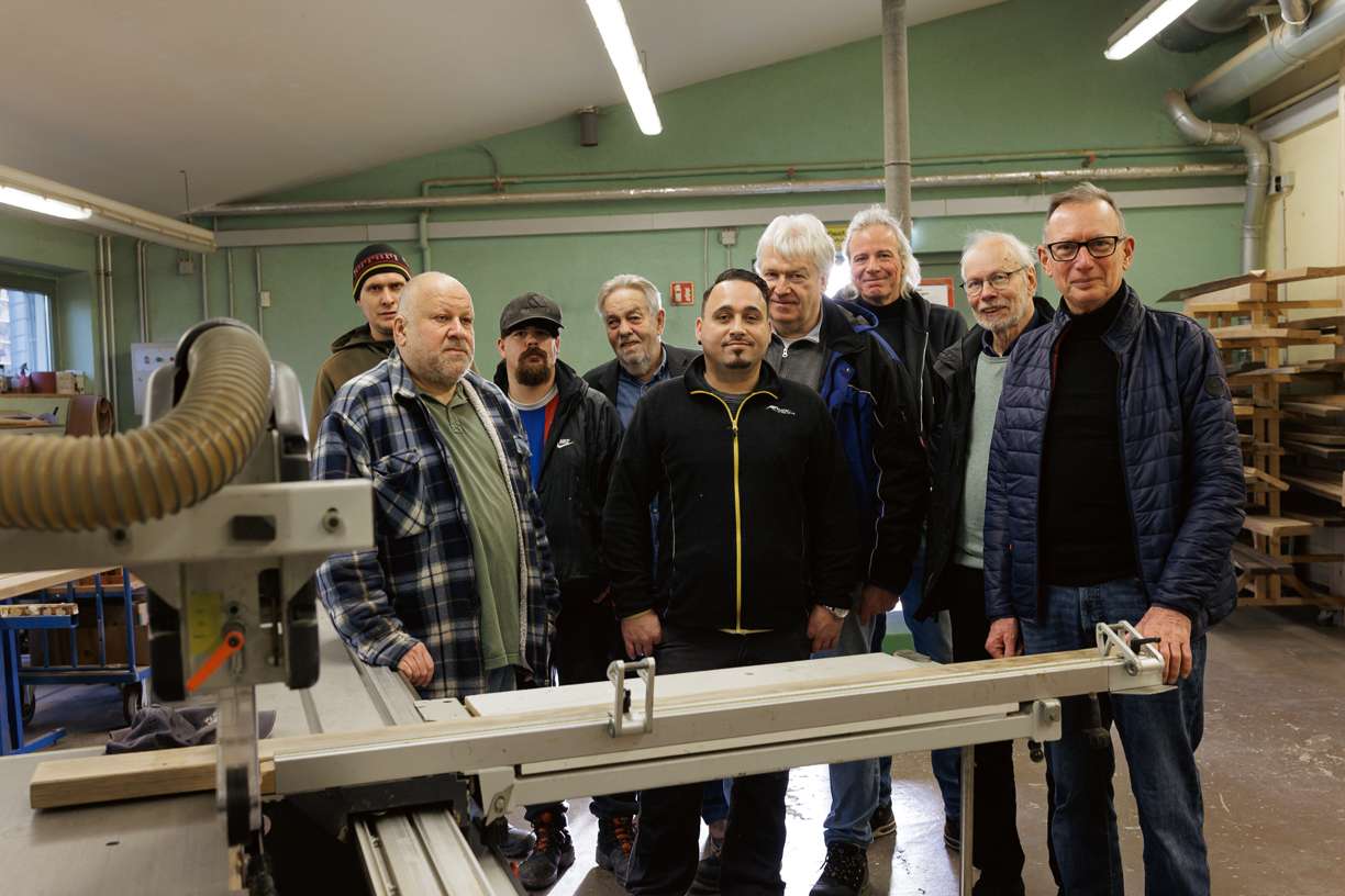 Drei Mitarbeiter der Holz-Werkstatt mit Werner Zahn (von links), Markus Otremba, Dirk Uphoff, Rainer Heidenreich, Dr. Bernd Groeper und Dr. Joachim Kleinmanns.