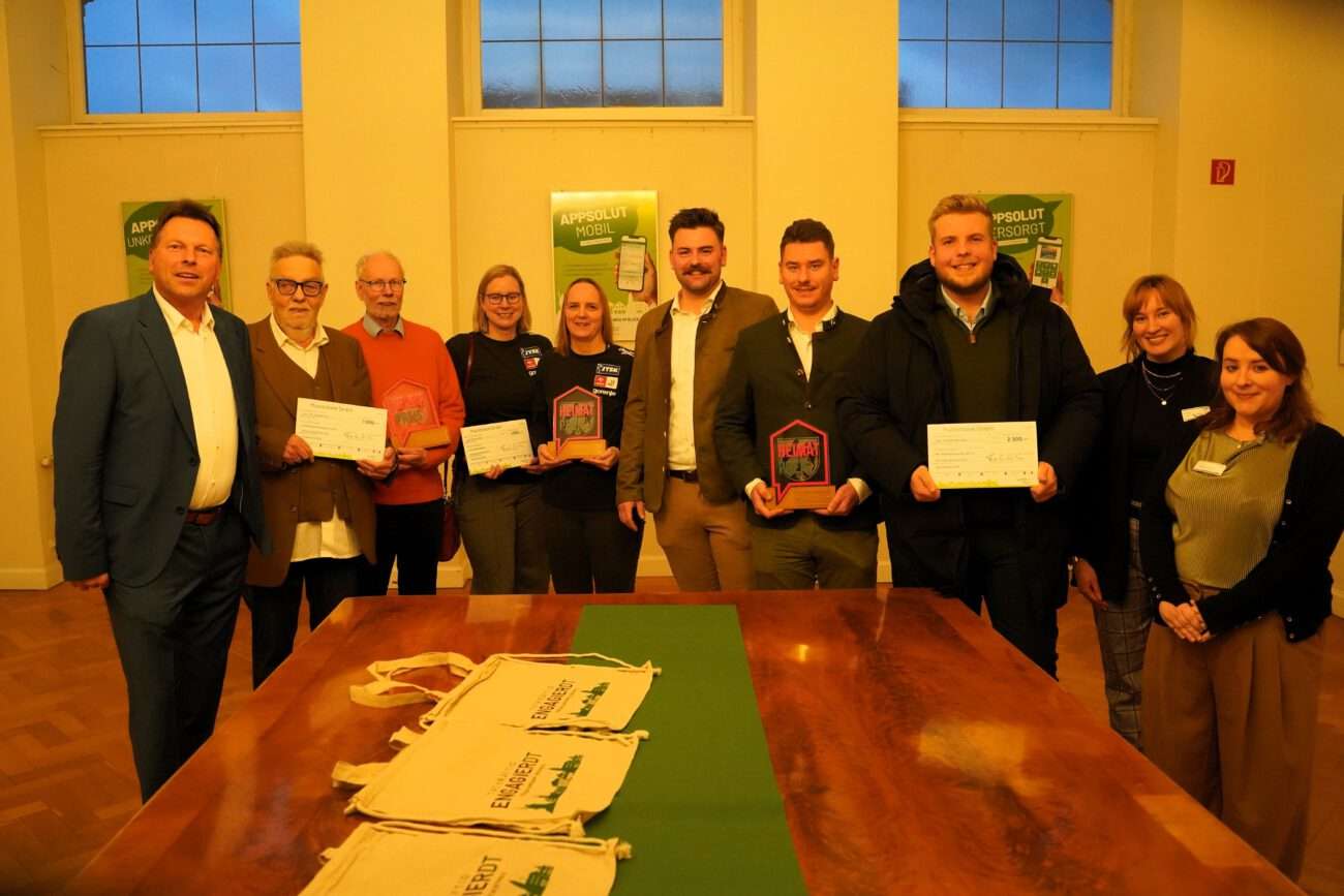 Verleihung des Heimat-Preises 2025 mit (von links) Bürgermeister Frank Hilker, Werner Zahn und Dr. Bernd Groeger für das Projekt „Heiligenkirchens Geschichte erforschen und vermitteln“, Sonja Girod und Nadine Pankratz (Handballglück Detmold), Cord-Henrik Starke, Julius Krome und Paul Maaß (KKLGV Brokhausen) sowie Nora Moos und Kathrin Prill aus dem Team Ehrenamt der Stadt Detmold +++ Foto: Stadt Detmold