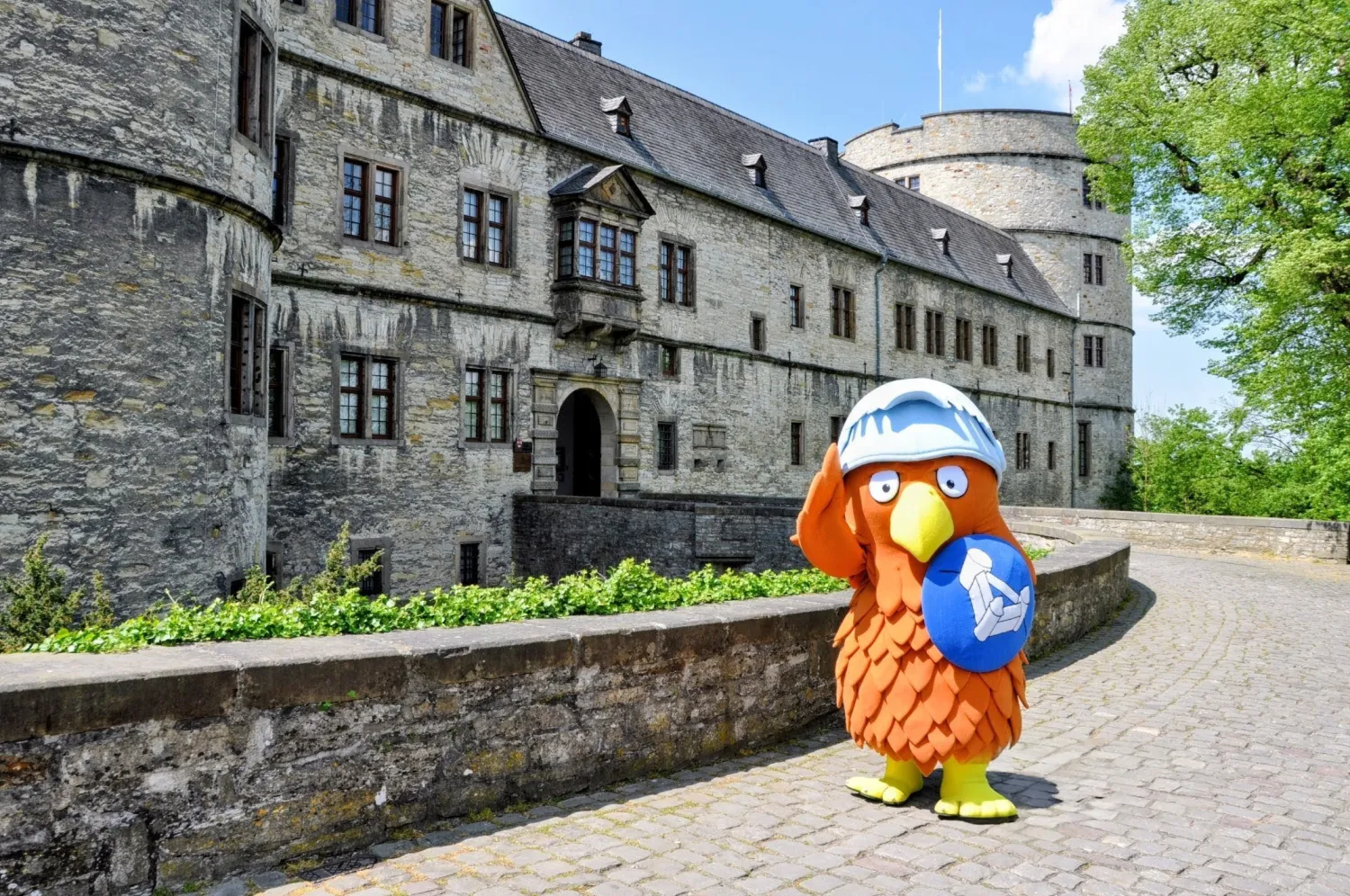 Bild: Beim Familientag am Sonntag, 3. Mai, treffen von 11 bis 16 Uhr an der Wewelsburg die Maskottchen Holli und Falko aufeinander. Der Eintritt ist ganztägig frei (Foto: ©Kreismuseum Wewelsburg, Gloria Bialas).