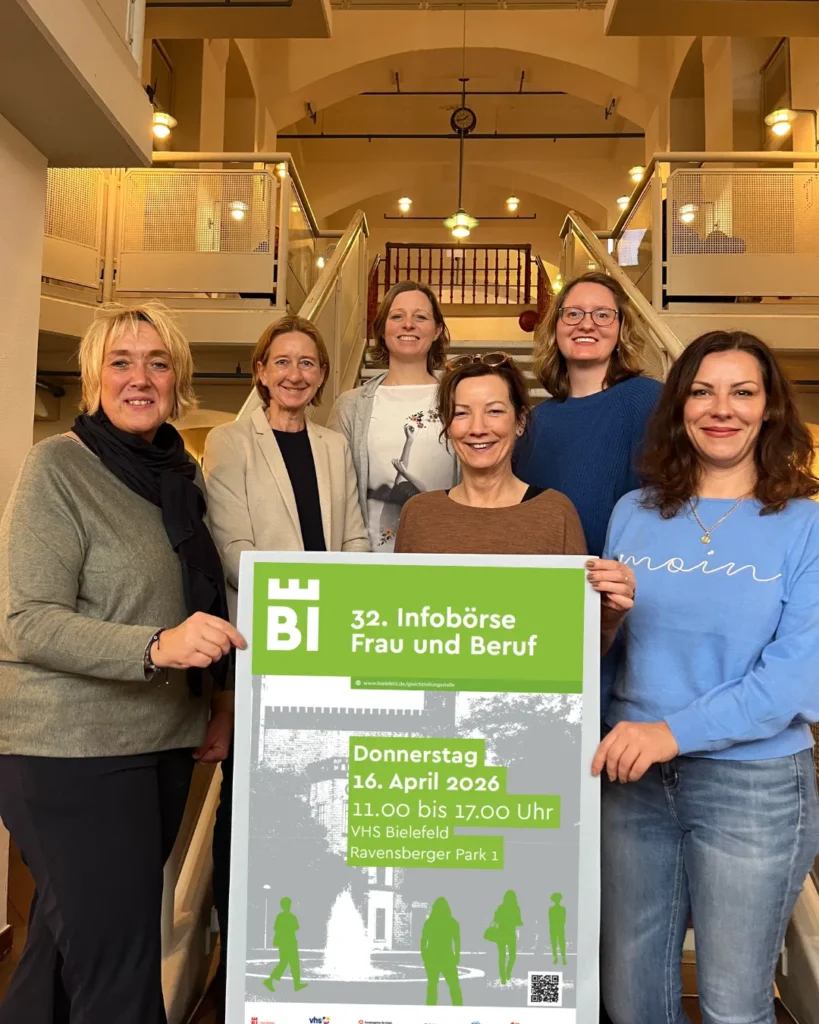 Das Planungsteam der Infobörse „Frau und Beruf“ (v. l.): Diana Glanz (Agentur für Arbeit), Gesa Falk (Deutsche Angestellten-Akademie), Greta Steinhardt (CREOS), Monika Kruse (Gleichstellungsstelle Stadt Bielefeld), Nerea Discher (VHS Bielefeld), Natalia Hesse (Jobcenter Arbeitplus Bielefeld). Foto: Stadt Bielefeld
