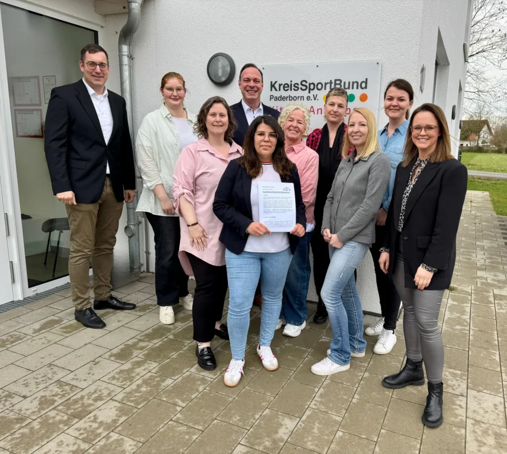 Freuen sich auf die weitere Zusammenarbeit: (v. l.) (Manuel Tegethoff (Fachbereichsleiter Bildung, Sport Kultur), Marie Brokmeier (Fachbereich Bildung, Sport Kultur), Bürgermeister Johannes Lindhauer, Karin Suerland (Trägervertretung KreisSportBund Paderborn e.V.), Annemarie Frost (Sozialpädagogin der GS Boke), Verena Burshille (Leitung KiTa Bentfeld, Sabine Reußner (Leitung KiTa Anreppen), Cornelia Steppuhn (Schulleitung Lippe-Grundschule), Marleen Voß (stellv. Leitung KiTa Lippenest Boke), Patricia De Pascalis Ferreira (Leitung KSB KiTa in Anreppen) +++ Foto: Stadt Delbrück