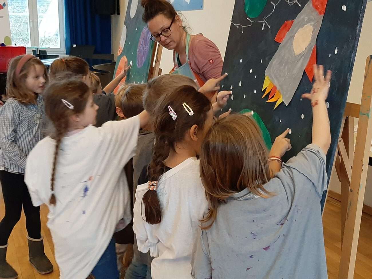 Die Live-Musik der Kinder inspirierte die Kunstwerke und schuf eine spannende Verbindung zwischen Musik und Malerei – ein kreatives Erlebnis, das Fantasie und Ausdruckskraft förderte. Zum Abschluss jedes Workshoptages durften die Familien die Ergebnisse bestaunen, eingebettet in eine Geschichte vom Pinsel Puck, der ins Weltall reiste und Fantasiewelten zum Leben erweckte.