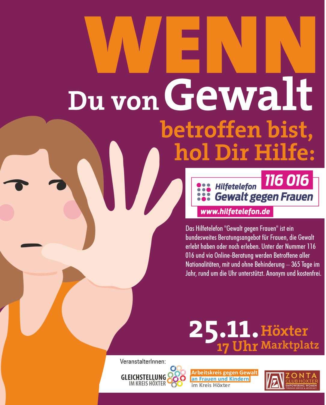 Ein besonderer Höhepunkt markiert den Start der Aktion am Montag, 25. November, ab 17 Uhr auf dem Marktplatz Höxter. Neben den Veranstalter*innen vom Arbeitskreis gegen Gewalt an Frauen und Kindern im Kreis Höxter, dem Zonta Club Höxter sowie den Gleichstellungsbeauftragten im Kreis Höxter wirken auch das Berufskolleg Höxter und das Berufskolleg Brakel mit, unterstützt vom Verein Marah e.V. und der Gruppe KraftArt. Für den musikalischen Auftakt sorgt der HLC mit Drums Alive.