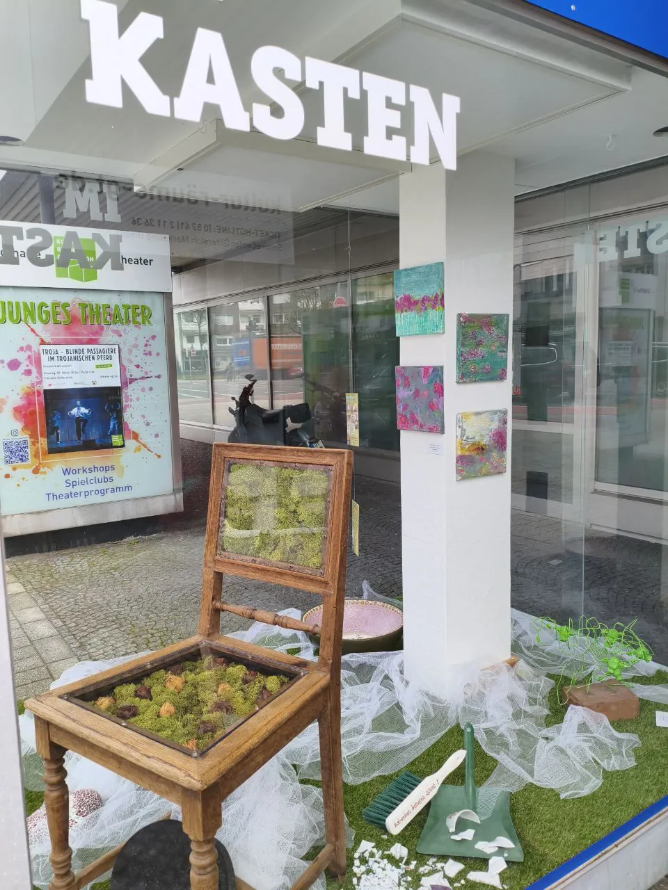 Die „Kunst im Kasten-Vitrine“ vor dem Rathaus zeigt bis Juni Werke der Versmolder Künstlerin Petra Kuhn. Foto: Stadt Gütersloh