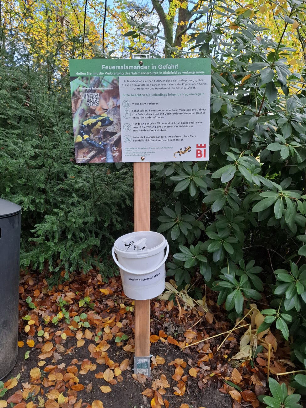 Seitdem im Jahr 2024 erstmals die Salamanderpest in Bielefeld nachgewiesen wurde, breitet sich diese in Bielefeld immer weiter aus. Bei der Salamanderpest handelt es sich um eine hochansteckende Pilzinfektion, die durch den Chytridpilz Batrachochytrium salamandrivorans (kurz Bsal) verursacht wird. Um die lokale Feuersalamanderpopulation bestmöglich zu schützen und eine weitere Ausbreitung zu verlangsamen, haben der Umweltbetrieb und das Umweltamt der Stadt Bielefeld unter Einbindung der Universität Bielefeld sowie der Biostation Gütersloh-Bielefeld mögliche Schutzmaßnahmen vereinbart. Als Ergebnis der gemeinsamen Beratungen werden in den kommenden Tagen Hinweisschilder im und rund um den Botanischen Garten aufgestellt.