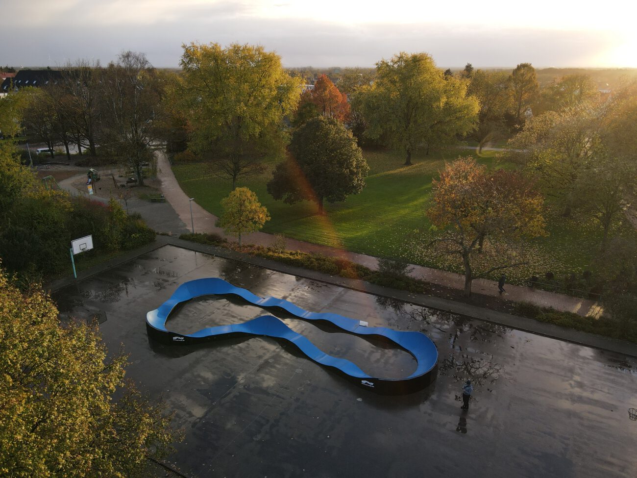Die Rollschuhbahn eignet sich sehr gut für den Pumptrack, da sie befestigt ist und kaum Gefälle aufweist. Der Pumptrack wurde so platziert, dass weiterhin sowohl die beiden Basketballkörbe als auch die weitere Fläche für Rollsport aller Art nutzbar bleiben.