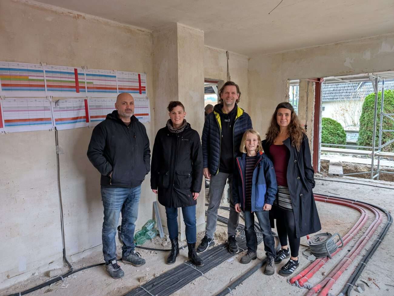 Bild: Sanieren ein Wohnhaus im Sprint (v.l.): Sanierungscoach Klaus Barkmann, Svenja Schröder vom städtischen Umweltamt, sowie die Hausbesitzer Kolja, Mika und Clarissa Dunkel. Foto: Stadt Bielefeld
