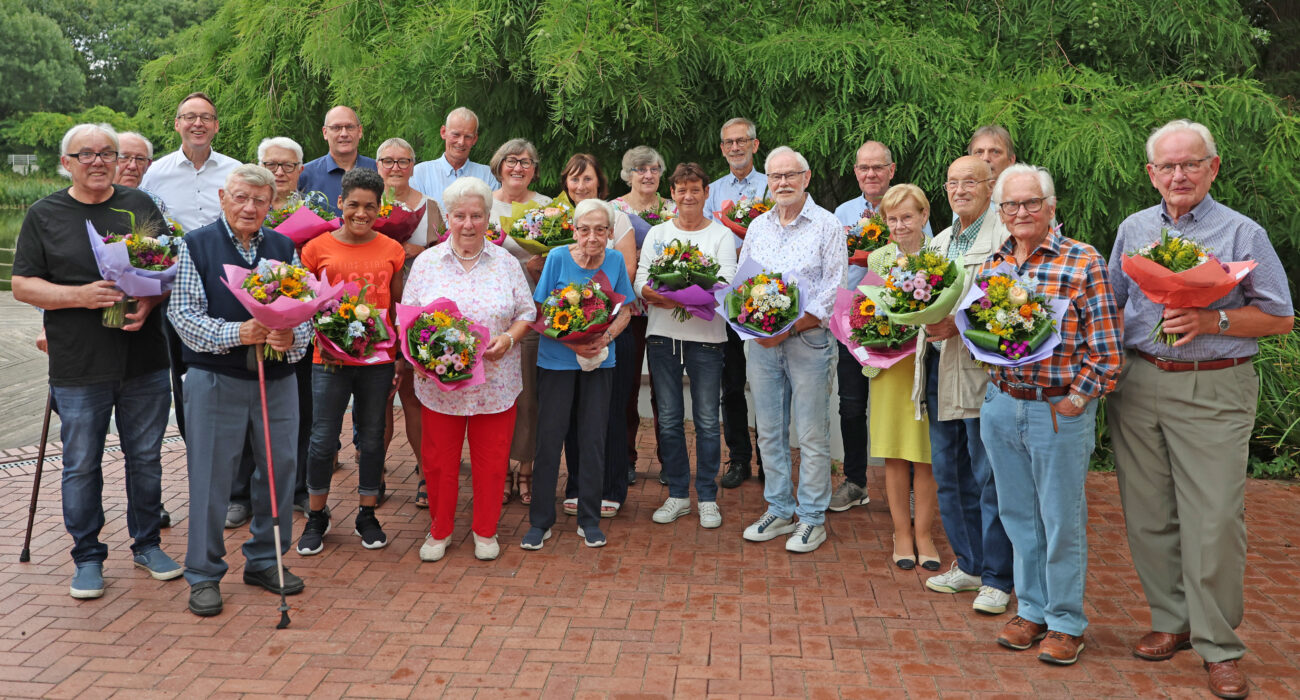 Ein besonderer Moment der Veranstaltung war die Ehrung der anwesenden 15 Sportabzeichen-Jubilare, die das Abzeichen bereits mindestens zehn Mal errungen haben – ausgezeichnet in 5er-Schritten bis hin zur bemerkenswerten 60. Wiederholung. Bürgermeister Matthias Trepper ließ es sich nicht nehmen, den Jubilaren persönlich zu gratulieren und ihnen neben ihrer Urkunde mit dem Abzeichen auch ein Gütersloh-Puzzle zu überreichen, das zur 200. Jahrfeier der Stadt herausgebracht wurde. „Das Sportabzeichen ist nicht nur ein Zeichen für persönliche Fitness, sondern auch ein Symbol für Disziplin, Beständigkeit und den unermüdlichen Willen, Ziele zu erreichen“, lobte Bürgermeister Trepper die Anwesenden. „Sie fordern sich selbst heraus, inspirieren gleichzeitig aber auch andere, einen aktiven Lebensstil zu pflegen.“ Als es zu der Ehrung des letzten Jubilars kam, ging ein anerkennendes Raunen durch den Raum des Spexarder Bauernhauses. Denn Hermann Strutz hat 2024 sein bemerkenswertes 60. Sportabzeichen abgelegt. Bei Entgegennahme seiner Auszeichnung gewährte er Einblicke in seine bewegte sportliche Karriere. Sein Engagement und seine Disziplin beeindruckten nicht nur die Anwesenden, sondern setzen auch ein starkes Zeichen für lebenslange sportliche Aktivität. Britta Thieme vom städtischen Fachbereich Sport verriet, dass Hermann Strutz vor wenigen Tagen bereits seine diesjährige Sportabzeichenprüfkarte eingereicht habe und damit die erste Person in dieser Sportabzeichensaison sei. Die nächste Jubiläumsfeier hat Hermann Strutz also schon im Blick.