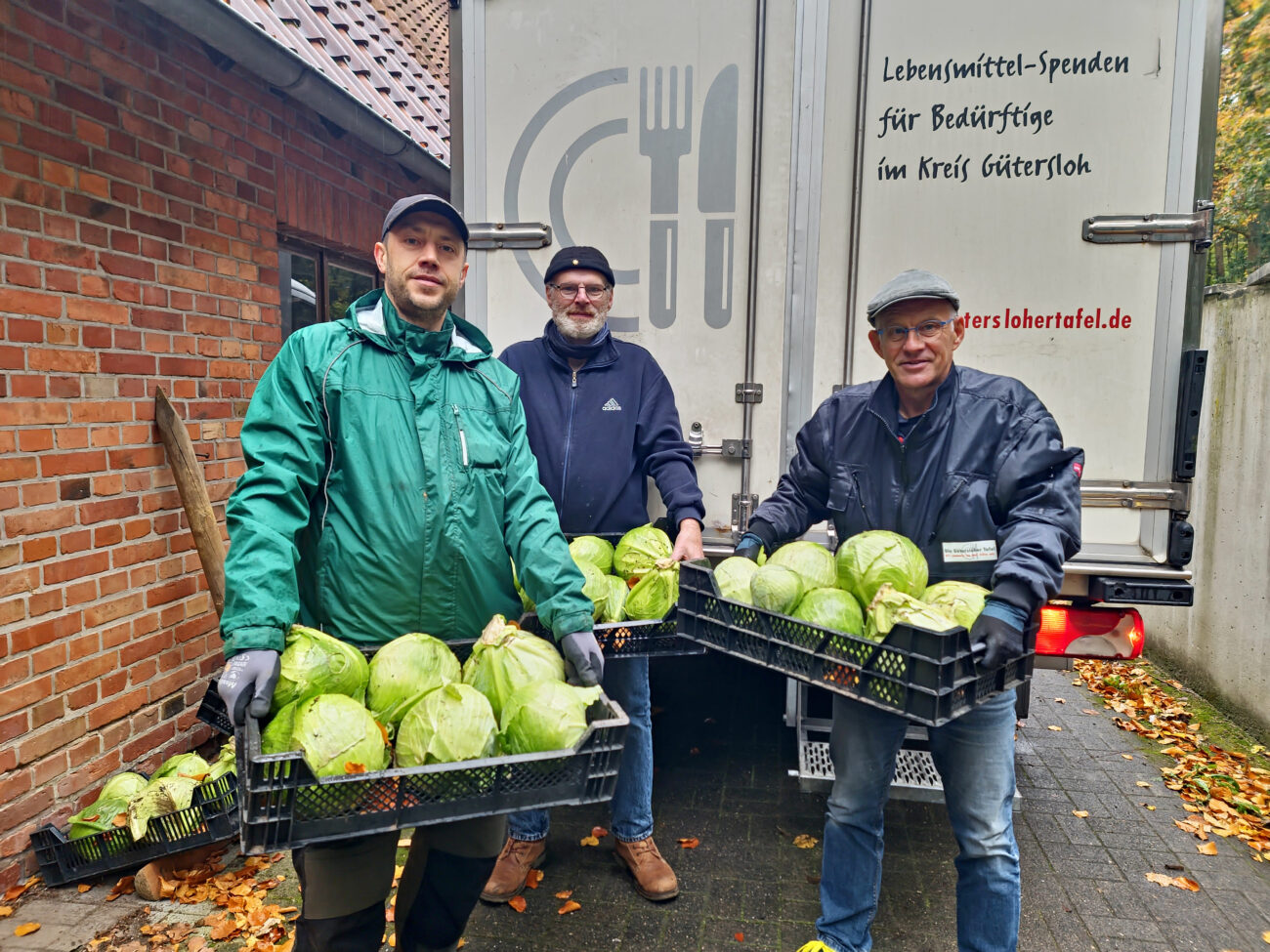 BU: (v.l.) Dimitri Gagelgans, Mitarbeiter des Fachbereichs Grünflächen, übergibt die reifen Weißkohlköpfe an Burkhard Träger und Manfred Stolz von der Gütersloher Tafel. Foto: Stadt Gütersloh
