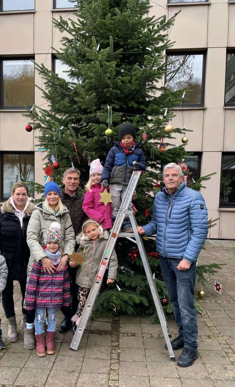 Kinder der Kita Topsi schmücken den Weihnachtsbaum vor dem Rathaus