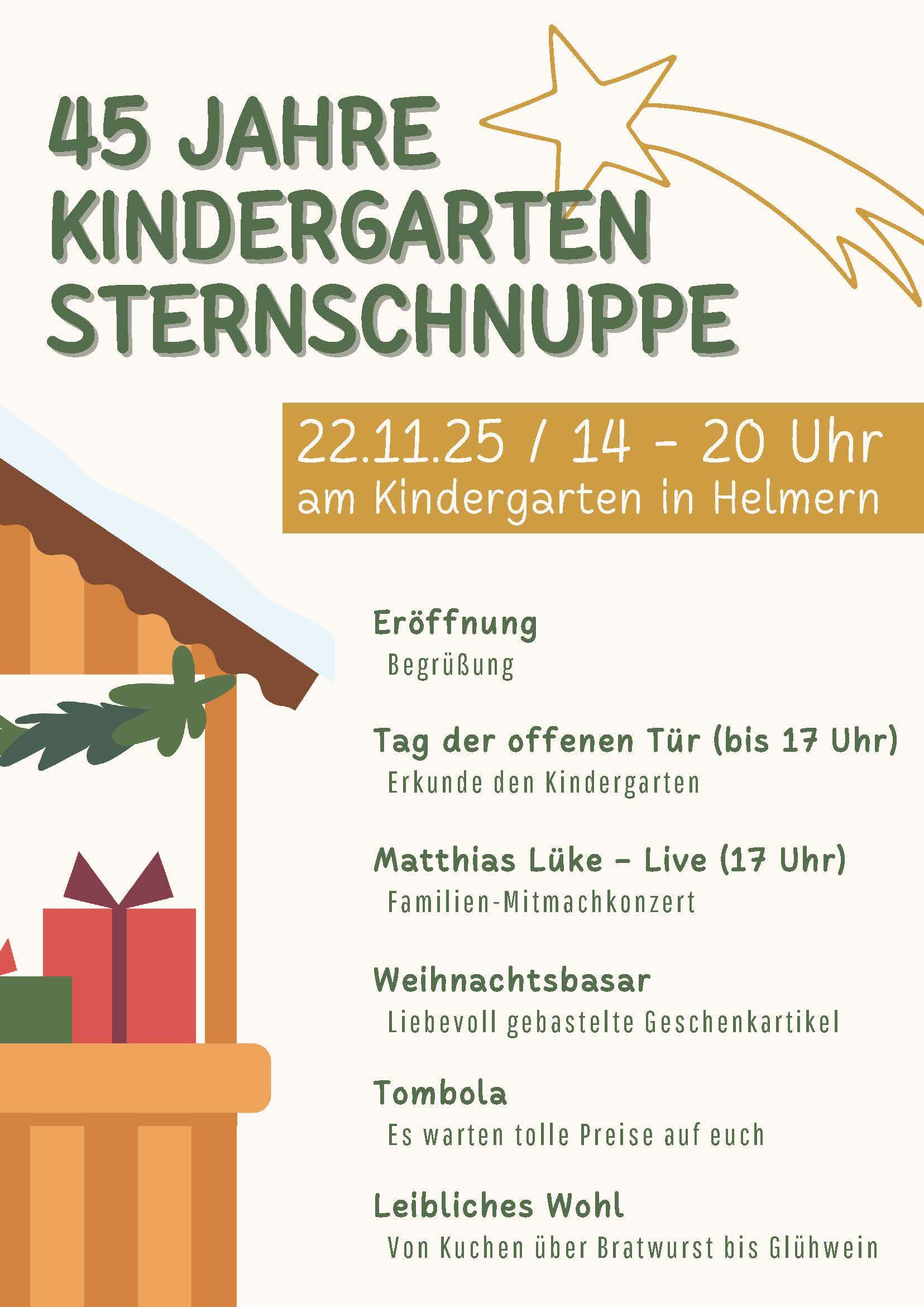 Bad Wünnenberg. Der Kindergarten Sternschnuppe in Helmern feiert am Samstag, 22. November, von 14 bis 20 Uhr sein 45-jähriges Bestehen mit einem Tag der offenen Tür, Weihnachtsbasar und ganz viel Programm für die ganze Familie.