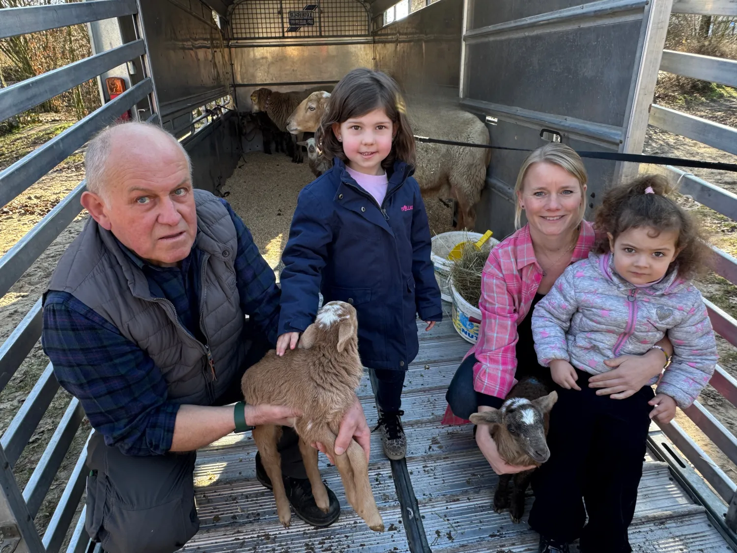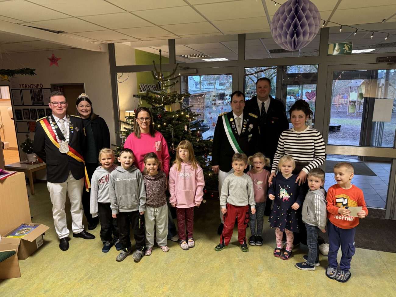 Foto: (v. l.) Tim Strunz und Lisa Strunz-Aring (Königspaar der St. Landolinus Schützenbruderschaft), Marleen Voß (stellv. Leiterin der KiTa Lippenest), Matthias Leutnant (stellv. Vorsitzender und Oberst der St. Landolinus Schützenbruderschaft), Daniel Jungmann (Freiwillige Feuerwehr, Löschzug Boke) und Lorena Mückenhaupt (Fachkraft KiTa Lippenest) freuen sich gemeinsam mit den Kindern über die festlich geschmückten Weihnachtsbäume.