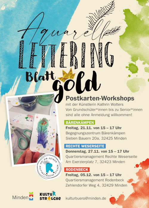 Minden. Kunst verbindet – nach diesem Motto findet der generationsübergreifende Postkarten-Workshop mit Künstlerin Kathrin Wolters an drei unterschiedlichen Terminen an drei verschiedenen Standorten in Minden statt. Es dürfen diverse Techniken des Aquarellmalens ausprobiert und sich kreativ ausgetobt werden: