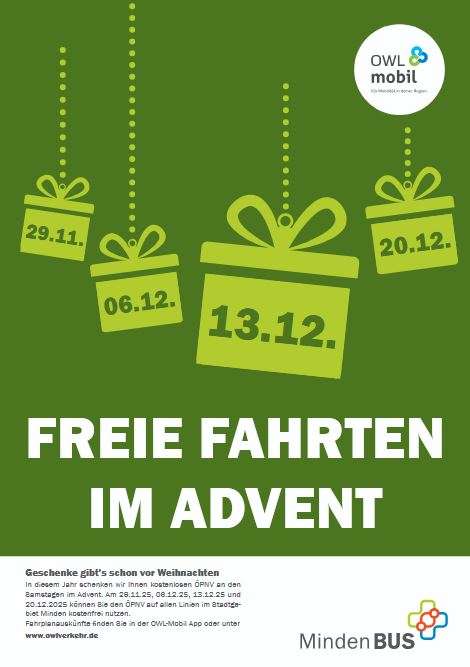 Minden. An drei Samstagen im Dezember kann man kostenfrei mit dem Bus im gesamten Stadtgebiet unterwegs sein. Mit der Aktion „Freie Fahrten im Advent“ sollen alle Mindener*innen die Gelegenheit haben, in der Adventszeit unkompliziert mobil zu sein. Los geht es am 29. November. Auch am 6., 13. und 20. Dezember kann man einfach ohne Ticket in den Bus einsteigen und losfahren.