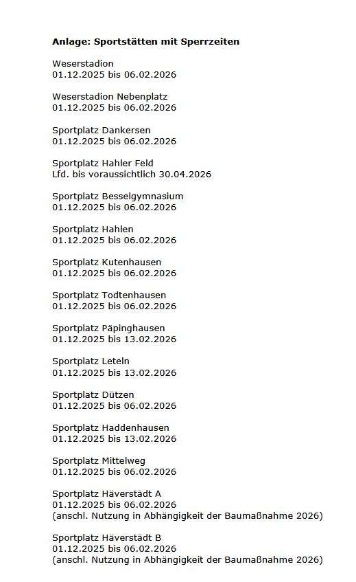 In Schlechtwetterphasen sollten die Plätze, wenn sie für den Spielbetrieb freigegeben sind, nicht allzu hohen Belastungen ausgesetzt werden. Denn: Im Winter befindet sich der Rasen in der Ruhephase, da aufgrund der Wetterlage die Belastung der Grasnarbe nicht durch das natürliche Wachstum ausgeglichen werden kann. Durch die Nutzung der Flächen bei ungünstiger Witterung wie Schnee, Schneeregen, Regen und Bodenfrost werde der Rasen sehr stark belastet und geschädigt. Langzeitschäden seien die Folge, so die Stadt Minden.