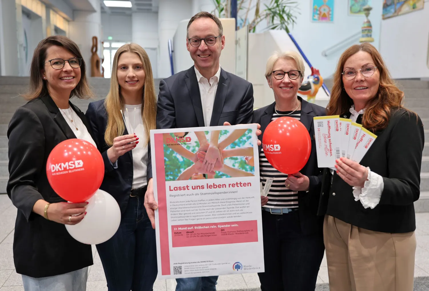 Bettina Zodrow, Izabela Ciecierska, Bürgermeister Theo Mettenborg, Fachbereichsleiterin Claudia Brügge-Siebelhoff und Helga Kuhn vom Personalservice der Stadtverwaltung laden alle zur Typisierungsaktion im Foyer des Rathauses ein.