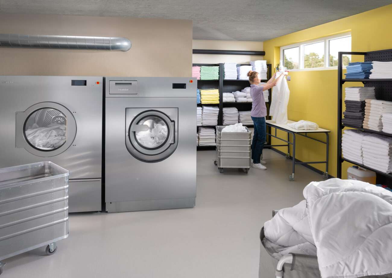Mehr Platz als bisher ist in den neuen Waschmaschinen für 27 und 35 Kilogramm Beladung. Zusätzlich sorgt ein G-Faktor von über 500 für eine hohe Schleudereffizienz, sodass die Textilien für den Trockenprozess optimal vorbereitet sind. Dadurch lassen sich Verbrauchskosten und Arbeitszeit einsparen. (Foto: Miele)