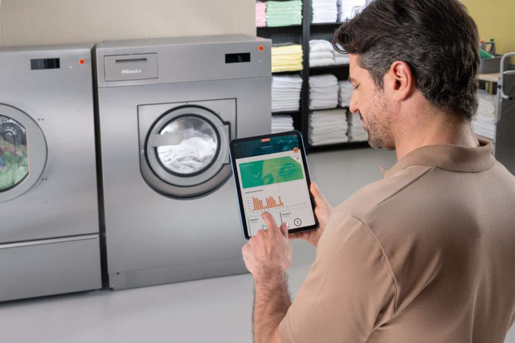 Auch die neuen Waschmaschinen sind für die Vernetzung mit dem digitalen Portal „Miele MOVE Connect“ vorbereitet. Hier kann geschultes Personal die Betriebsdaten einsehen und erfährt zum Beispiel, welche Mengen an Wasser und Energie pro Charge nötig waren. (Foto: Miele)