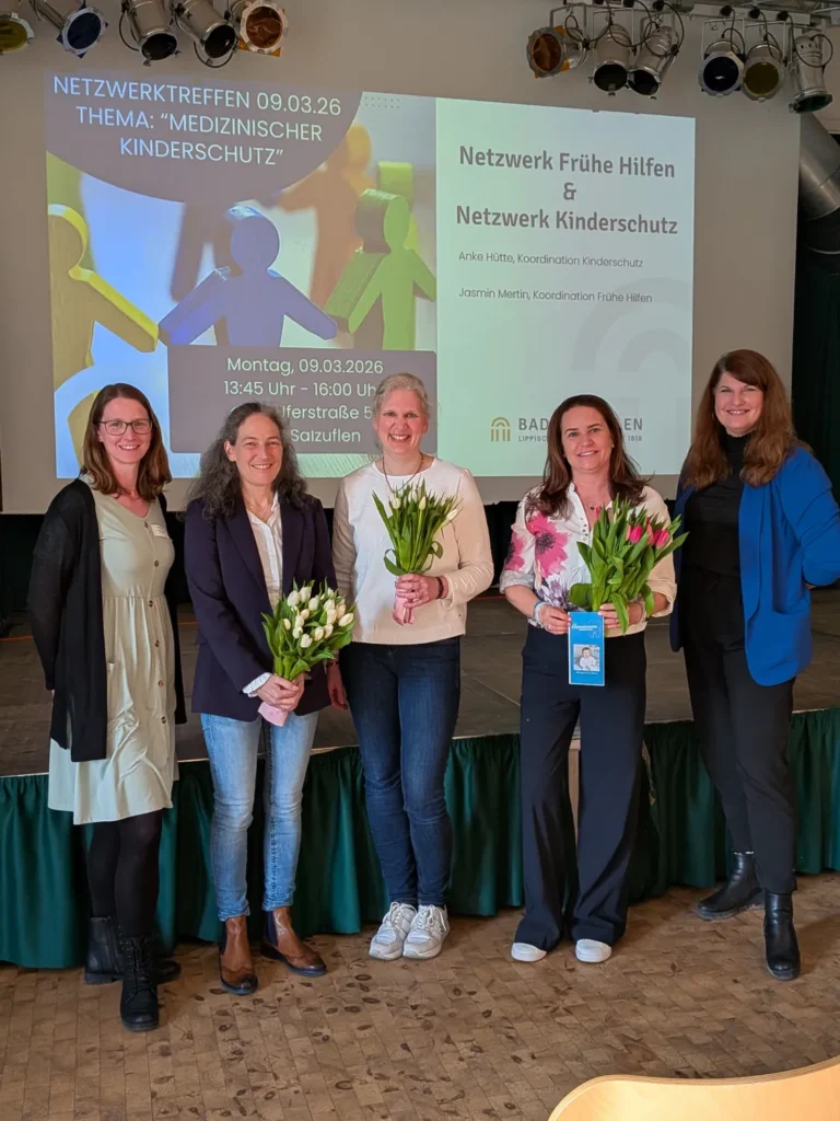 Ein durchweg positives Fazit nach dem Netzwerktreffen „Frühe Hilfen“ und „Kinderschutz“ zum Thema „Medizinischer Kinderschutz“ zogen (von links nach rechts) Jasmin Mertin (Frühe Hilfen, Stadt Bad Salzuflen), Dr. Maren Müller–Schiefer (Zahnärztlicher Dienst, Kreis Lippe), Simone Kellner (Kinder- und Jugendärztlicher Dienst, Kreis Lippe), Dr. Katharina Hübner (Zahnärztin und Beauftragte für zahnmedizinische Prävention Bezirksstelle Lippe) und Anke Hütte (Koordinierungsstelle Kinderschutz, Bad Salzuflen). © Stadt Bad Salzuflen