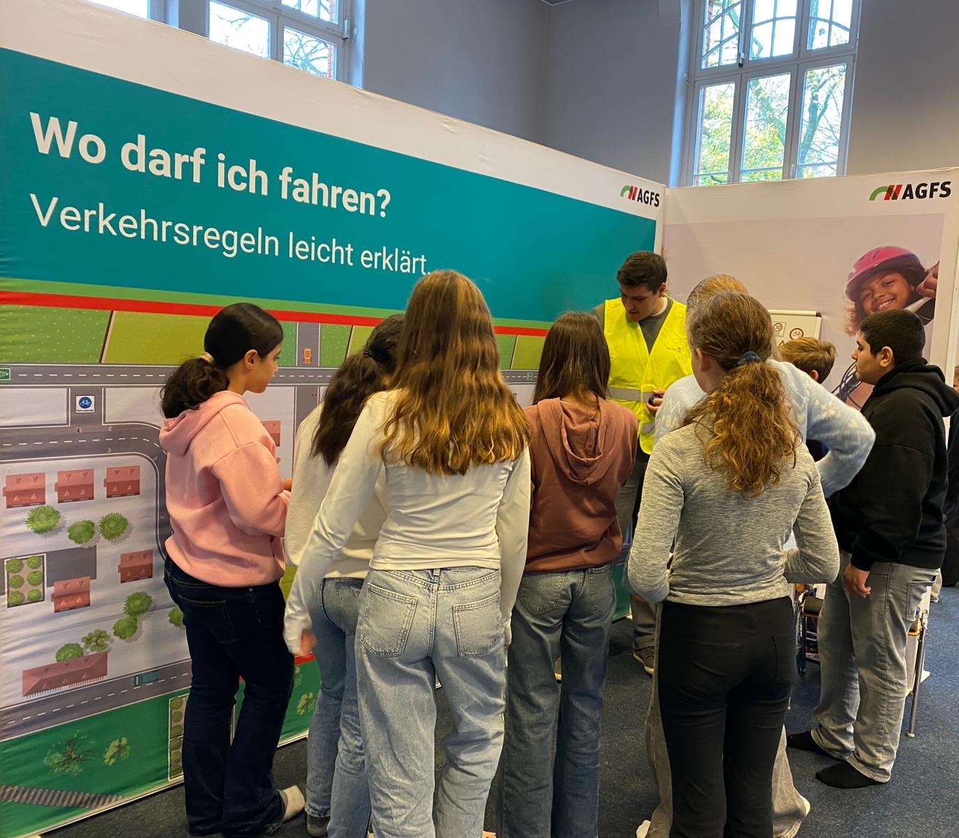 Im ersten Modul wurden Alltagssituationen aus der Sicht eines Radfahrers bzw. einer Radfahrerin nachgestellt. Die Schüler*innen traten selbst in die Pedale und erlebten, dass sie im Straßenverkehr all ihre Konzentration und Aufmerksamkeit benötigen, um Gefahrenpunkte frühzeitig zu erkennen. Beim Reaktionstest erfuhren die Kinder, wie herausfordernd es ist, rechtzeitig auf wechselnde Signale zu reagieren. Wichtige Verkehrszeichen und die dazugehörigen Regeln wurden auf einer Karte erklärt. Abschließend untersuchten die Jugendlichen die Wirkungsweise verschiedener reflektierender Materialien wie Warnwesten, denn Sichtbarkeit im Straßenverkehr bedeutet mehr Sicherheit für alle.