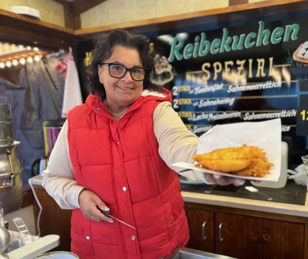 Ab jetzt gibt es dienstags, donnerstags und samstags Reibekuchen auf dem Citymarkt auf dem Berliner Platz. Beate Heppenheimer präsentiert ihre Leckereien. Foto: Stadt Gütersloh