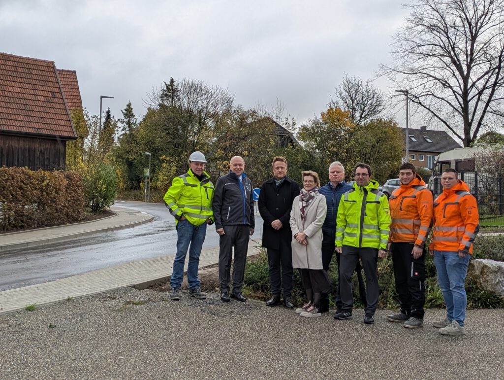 Die Ortsdurchfahrt in Lichtenau-Grundsteinheim ist wieder befahrbar – Vor Ort ein Bild machten sich Dietmar Wind vom Ingenieurbüro AGC, Landrat Christoph Rüther, Henrik Egeler, Dezernent der Kreisverwaltung, Lichtenaus Bürgermeisterin Ute Dülfer, Bernhard Brand von der Bezirksregierung Detmold, Jens Kaiser vom Kreisstraßenbauamt sowie Paul Löseke und Marco Löseke von der Baufirma GFV (v.l.). +++ Foto: Kreis Paderborn