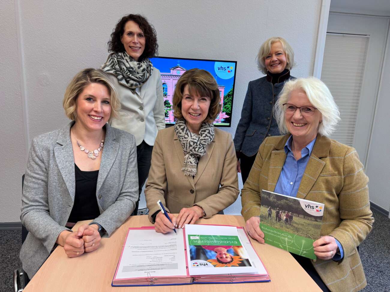 (v.l.) Kamen zusammen, um die Förderung der „ERLEBNISWOCHEN – Ferien.Bilden.Schüler. Bildungsferien mit der Osthushenrich-Stiftung“ durch die Osthushenrich-Stiftung für weitere drei Jahre schriftlich festzuhalten: (v.l.) Désirée Solle (Leitung der Volkshochschule Gütersloh), Henrike Dulisch (Pädagogische Leiterin, VHS), Dr. Martina Schwartz-Gehring (Vorstandsvorsitzende der Osthushenrich-Stiftung), Dr. Regina Bredenbach-Rämsch (Koordination der Erlebniswochen, VHS) und Claudia Holle (Geschäftsführerin der Osthushenrich-Stiftung). Foto: Stadt Gütersloh