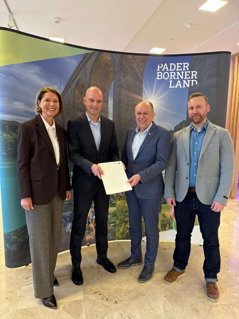 Eine stolze Summe für den Tourismus in der Region, die Paderborner Kreisverwaltung erhält einen Förderbescheid in Höhe von 1,6 Millionen Euro: Edith Rehmann-Decker, Leiterin des Amtes für Wirtschaft & Tourismus des Kreises Paderborn, Jens Kronsbein, Abteilungsleiter der Bezirksregierung Detmold, Landrat Christoph Rüther und Julian Skrzypietz vom Amt für Wirtschaft & Tourismus (v.l.).