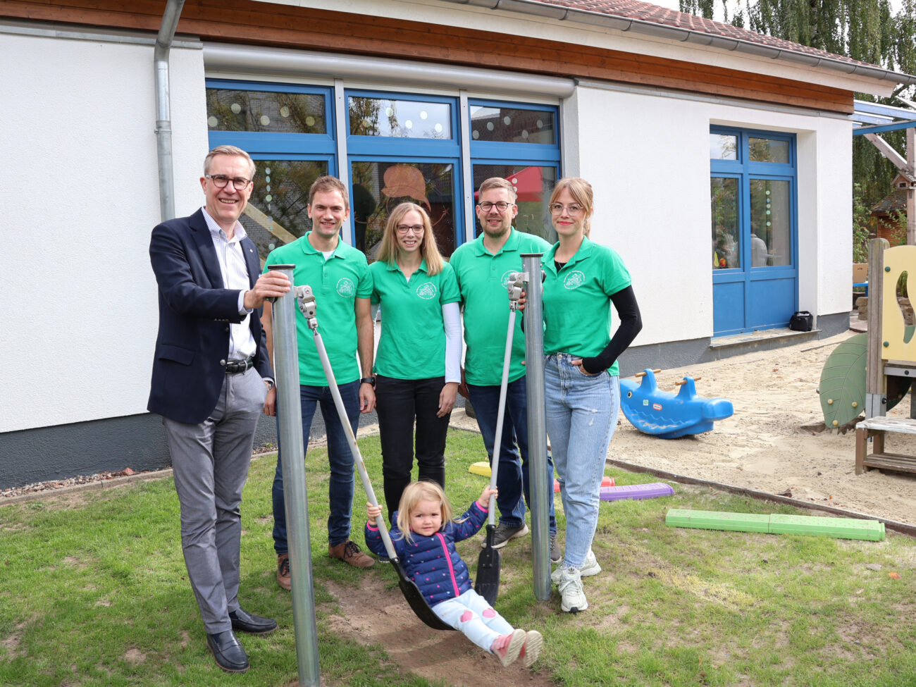 Mario Hoffmeister (von links) übergibt die neue Minischaukel an David Brandhorst, Sara Riechmann, Nico Büttemeyer und Katrina Rüter. Jella hat sie schon für gut befunden.