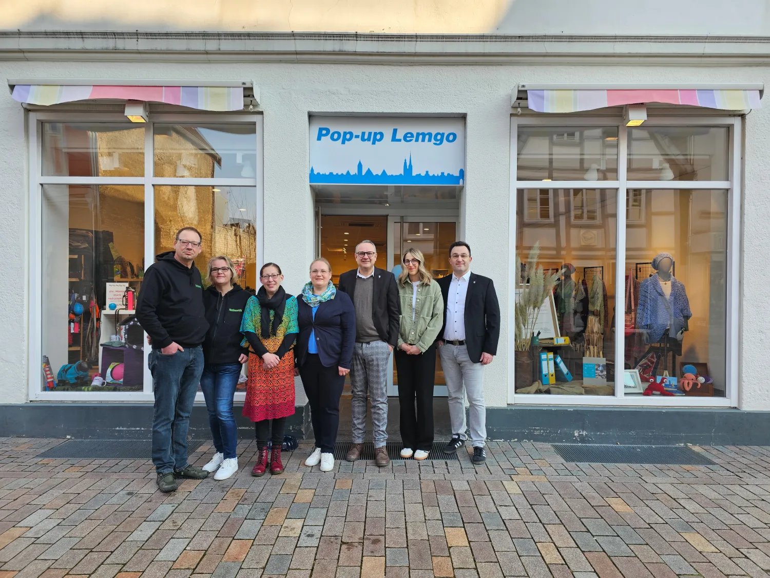Sie freuen sich über den Start des Popup-Ladens: (von links) Christian und Sandra Sollgan, Melanie Richard und Jakoba Faltinski mit Bürgermeister Markus Baier, Hanna Siggelkow und Tobias Vietz (beide Wirtschaftsförderung). (Foto: Alte Hansestadt Lemgo)