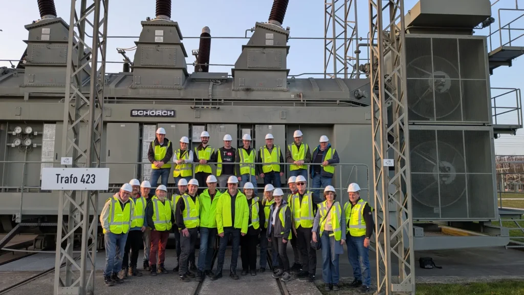 Besonders beeindruckend war für viele Besucherinnen und Besucher der 380-kV-Transformator, den die Gruppe aus nächster Nähe betrachten konnte. Auf dem massiven Stahlbau entstand auch ein gemeinsames Gruppenfoto, das die besondere Atmosphäre des Besuchs festhielt.