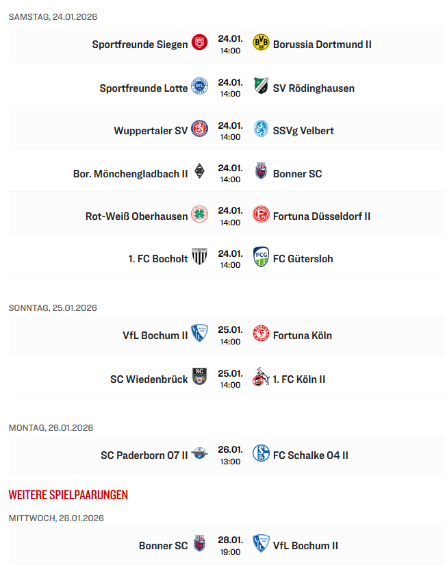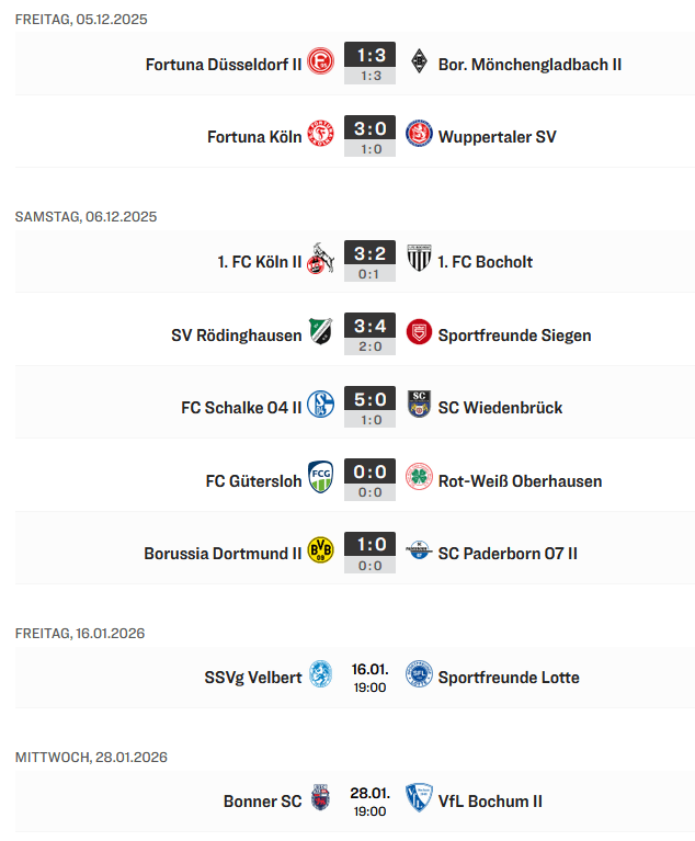 Köln II 1. FC Köln II | 18 | 9-2-7 9 | 2 | 7 | 35:37 | -2 | 29 | |