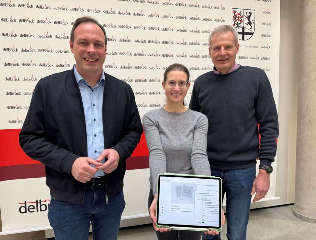 Bürgermeister Johannes Lindhauer (links) mit dem Fachbereichsleiter Bauen und Planen, Markus Hückelheim (rechts), sowie Senta Schulte aus der Bauordnung als Projektleiterin für die Einführung des digitalen Bauantrags bei der Stadt Delbrück.