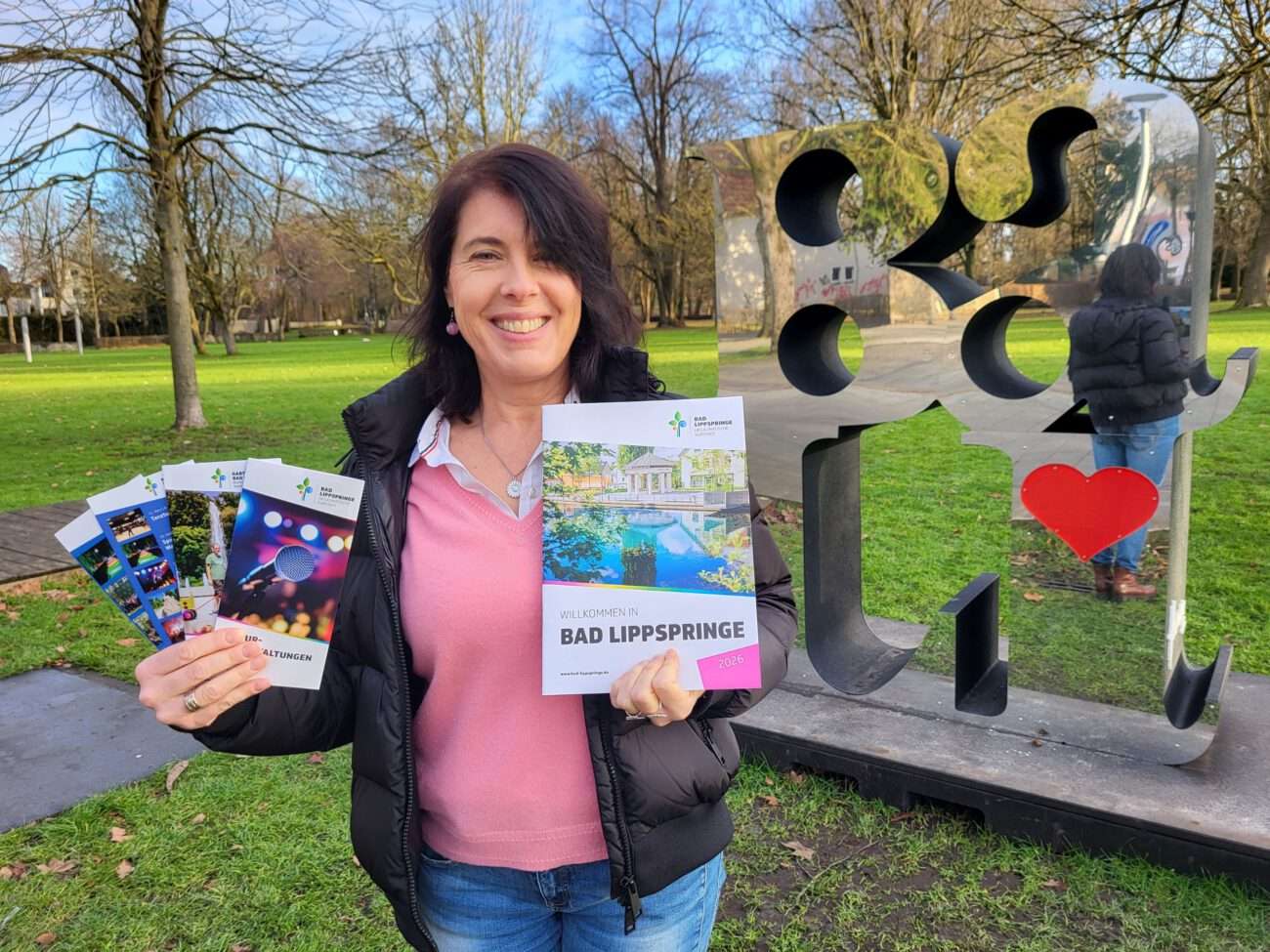 Die Urlaubs- und Freizeitsaison 2026 kann kommen: Stadtmarketing-ChefinAsli Noyan präsentiert die neuen Flyer und Broschüren für Bad Lippspringe an der verspiegelten BaLi-Skulptur, die seit kurzem im Arminiuspark steht.