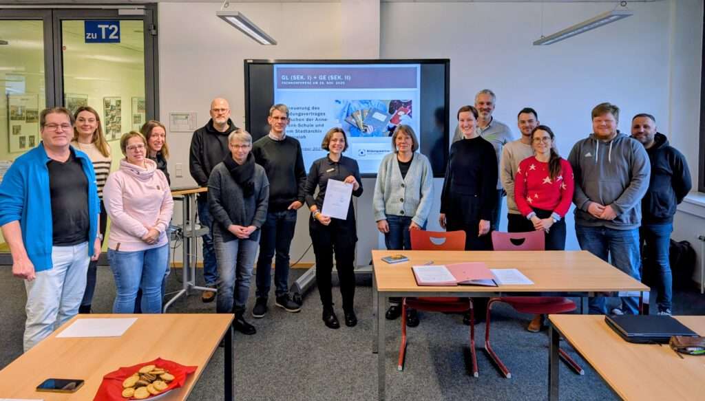 Gütersloh (gpr). Das Stadtarchiv Gütersloh und die Anne-Frank-Gesamtschule haben offiziell die Erneuerung und Weiterführung der Bildungspartnerschaft besiegelt. Ziel der Kooperation ist es, Schülerinnen und Schülern einen vertieften Zugang zur lokalen Geschichte, zur Arbeit mit historischen Quellen sowie zu Themen der Demokratiebildung zu ermöglichen. Die Vereinbarung sieht vor, künftig regelmäßig projektorientierte Workshops, Archivführungen und Unterrichtsmodule gemeinsam zu entwickeln. Dabei sollen historische Themen mit aktuellen gesellschaftlichen Fragen verknüpft und die jungen Menschen zu kritischem Denken und aktiver Teilhabe befähigt werden.