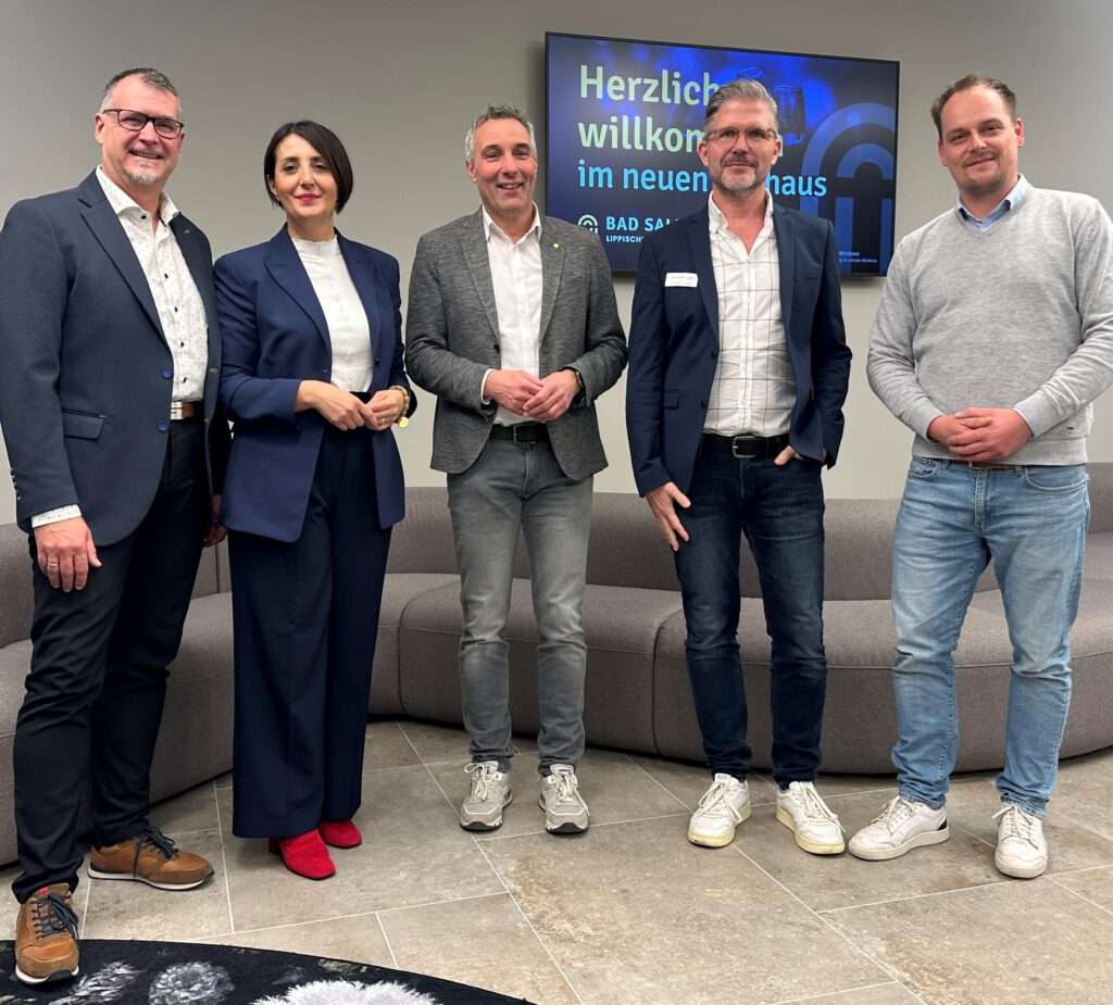 Einen erfolgreichen Austausch im Kurhaus über die Zukunft des Kur- und Gesundheitsstandortes Bad Salzuflen beim Veranstaltungsformat „TourismusDIALOG 2025“ hatten (von links) Alexander Seiz (Geschäftsführer Kohl & Partner), Anna-Lisa Davidovic (Leiterin GESUNDWERK Bad Salzuflen), Bürgermeister Dirk Tolkemitt und Ralf Hammacher (Fachbereichsleitung Touristik, Gesundheit und Kultur) sowie Alexander Bleifuß (Fachdienstleiter Tourismus, Marketing und Gesundheit). © Stadt Bad Salzuflen